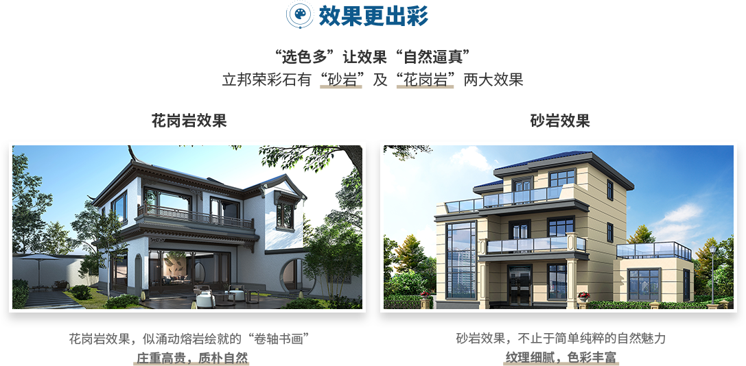 立邦榮彩石花崗巖效果賦予涂膜逼真的花崗巖仿石效果,涂膜柔性抗開裂,耐候、耐污性能優(yōu)異。